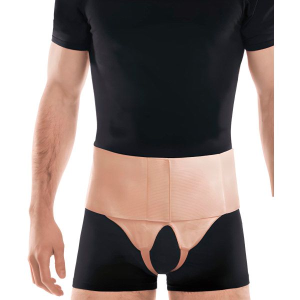 Бандаж противогрыжевой паховый универсальный изготовлен из синтетической ткани, имеет пояс и накладки на обе паховые области, что позволяет применять его у пациентов с двусторонними паховыми грыжами. Фиксирующий элемент обеспечивает удержание накладок в паховых областях над грыжевыми воротами, а также создает внешнюю компрессию и защиту.