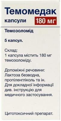 действующее вещество: 1 капсула содержит 5 мг, 20 мг, 100 мг, 140 мг, 180 мг или 250 мг темозоломида;