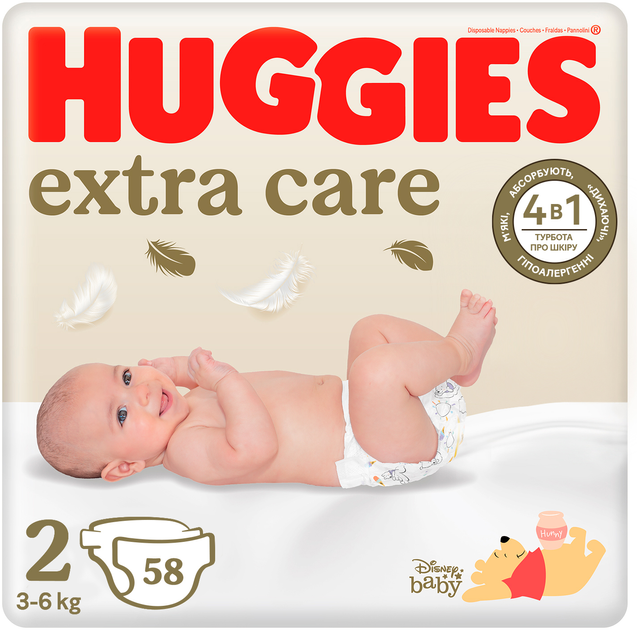 Підгузки Huggies Extra Care піклуються про ніжну шкіру малюка у ці важливі перші місяці життя, вони підходять як для хлопчика, так і для дівчинки. У кожній упаковці ви знайдете унікальні яскраві дизайни від Disney з героями мультфільмів про Вінні Пуха.