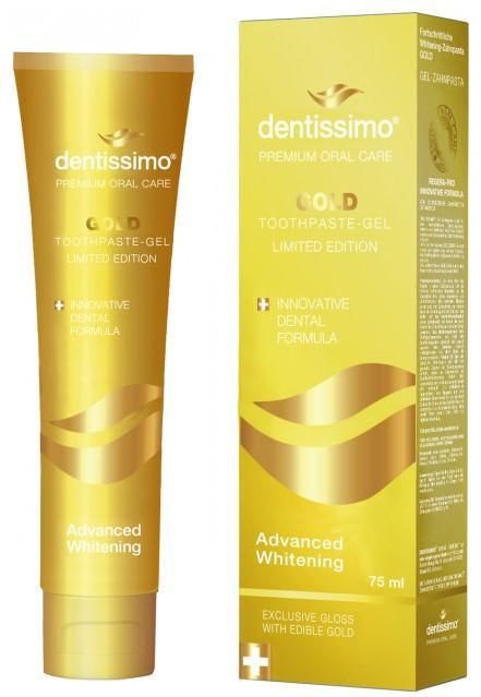 Зубная паста-гель Dentissimo Передовая отбеливающая Gold обеспечивает высокую эффективность отбеливания зубов. Такие преимущества, как золото и натуральные ингредиенты, способствующие результативному отбеливанию.